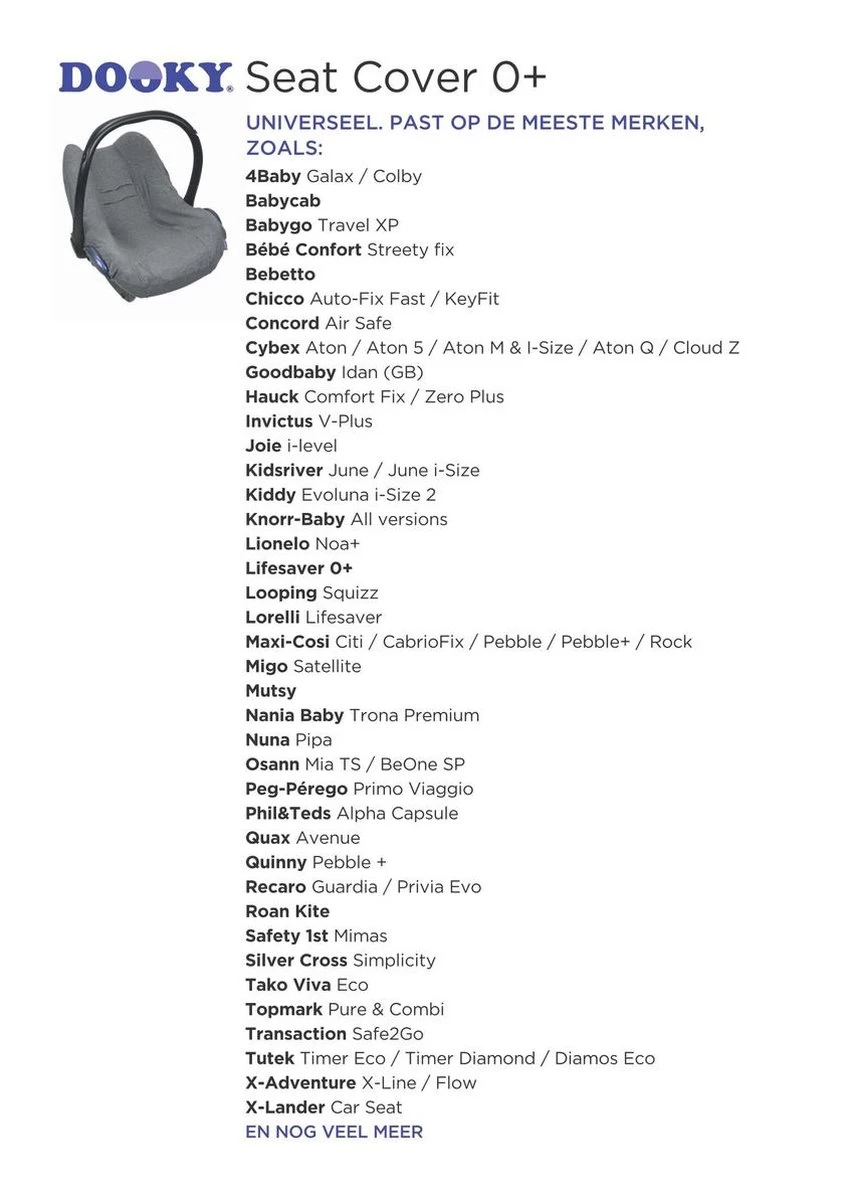 Verkrijgbaar in vele verschillende dessins en kleuren, is er voor ieder wat wils. En om het helemaal af te maken, zijn er bij Dooky bijpassende producten verkrijgbaar. Bijvoorbeeld een UV-bestendige zonnekap, gordelbeschermers, voetenzakken, dekentjes, slabbetjes, en zelfs zonnebrillen. Allemaal verkrijgbaar in bijpassende kleuren en dessins. Dus welk merk autostoeltje je ook hebt, je kunt deze helemaal opleuken in de stijl die jij wilt!