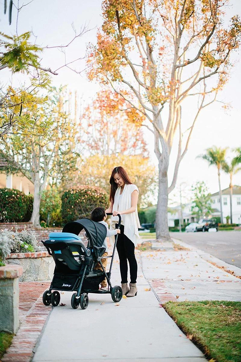 Met de meest compacte en wendbare dubbele kinderwagen verkrijgbaar, kan jouw oudere kind op het achterste platform of zitbankje zitten en staan.